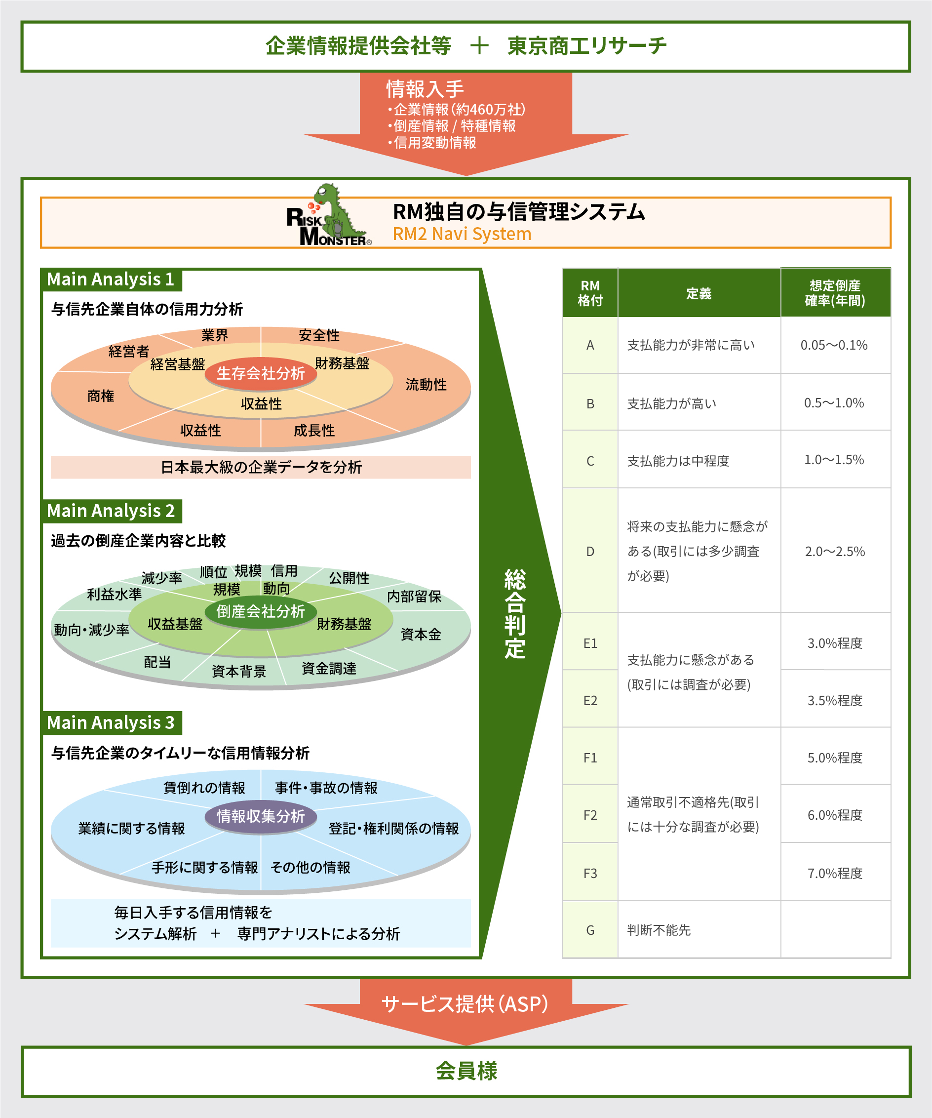 定期的なデータの更新による変更に留まらず、毎日の信用情報の収集・分析によりアナリストが補正を続けているのもRM格付の大きな特長です。審査ロジックは、年に2回倒産傾向や経済・社会情勢に合わせて見直しを実施しておりますので、会員企業様は常にアップデートされた指標をご覧いただけます。