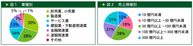 与信管理サービス会員のうち、上場企業およびその関連企業で約40%の導入実績を誇ります。またIPOを目指す成長企業でも積極的に導入されています。あらゆる業種にフィットしますので、業種業界問わずご利用いただけます(図1)。またどのような規模の会社様にも安心してお使いいただけるサービスです(図2)。