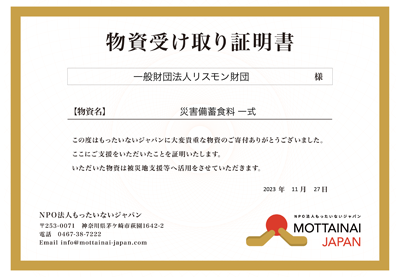 NPO法人もったいないジャパン(https://mottainai-japan.com/)は企業や家庭から年間に廃棄される新品同様の膨大な量の食糧や日用品を「もったいない精神」のもと、社会に還元していくことを目標としている団体です。リスクモンスターグループで購入している防災用備蓄食のうち、賞味期限が概ね3カ月後に迫るものを早めに入替を行い、寄付いたしました。