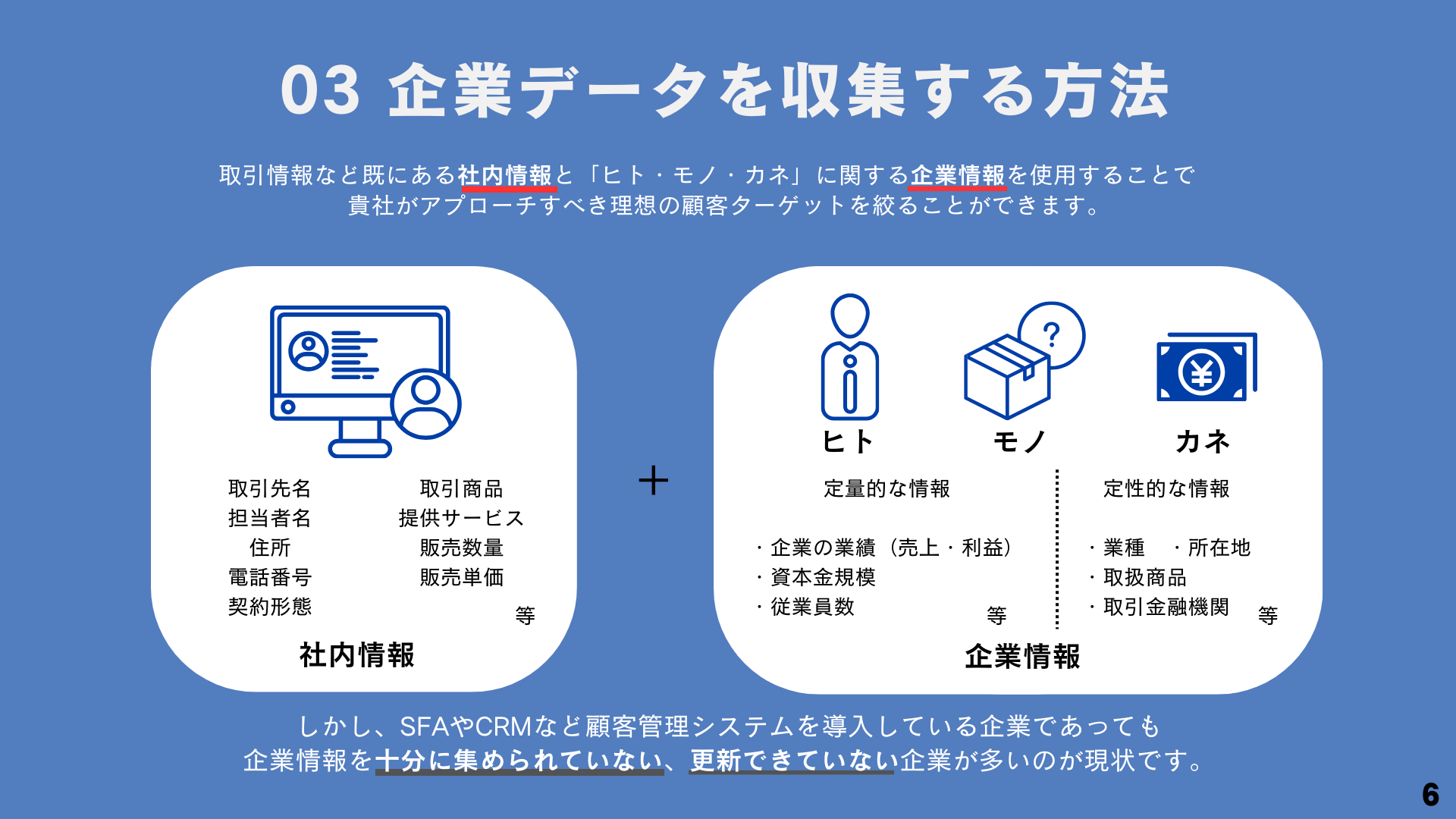 • 企業データや社内データを営業・マーケティング活動に活用したいが、何から始めればいいのか分からない