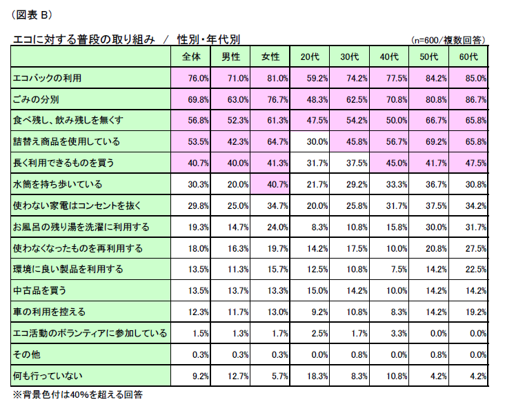 年代別でみると、過半数が取り組んでいる項目として、20代は「エコバックの利用」のみに留まる一方で、40代以上では「ごみの分別」、「食べ残し、飲み残しを無くす」、「詰替え商品を利用している」の計4項目において過半数が取り組んでおり、高齢世代ほどエコに対して積極的な取り組み姿勢であることが表れている。 (図表B)
