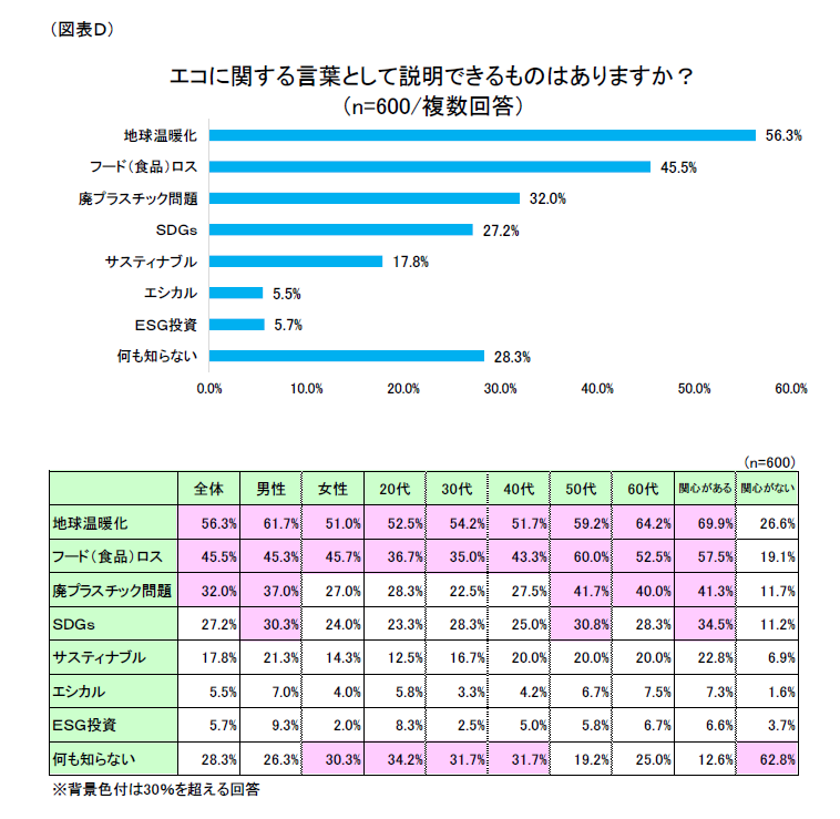 また、Environment(環境)、Social(社会)、Governance(企業統治)の3つの観点から投資先を選別する「ESG投資」や環境や人権に対して十分に配慮された商品やサービスを表す「エシカル」は、全ての属性で理解度が1割にも満たず、環境問題に関心がある人においても言葉が浸透していない状態となっている。(図表D)
