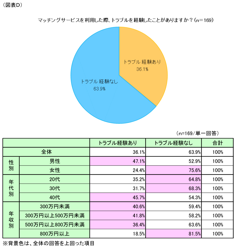 本調査によると、マッチングサービスの利用経験者のうち、3人に1人は何らかのトラブルを経験していることが分かった。近年では、その手軽さから利用者が増加しているが、マッチングサービスはその利便性の裏側にあるリスクを理解した上で利用することが肝要といえよう。