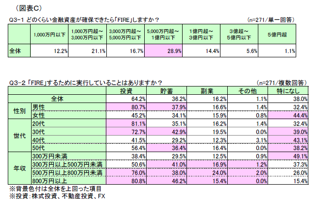 年収別では、「300万円未満」において「特になし」(同 49.1%)が最多回答となっており、2人に1人はFIREに対して憧れるものの、実際の行動に移していない状態と考えられる。一方、「500万円以上」においては、「投資」が8割前後の回答となっており、資金に余裕がある年収層においては、余裕資金を投資に回し、FIREの実現に向け資産運用している様子が表れている。(図表C)