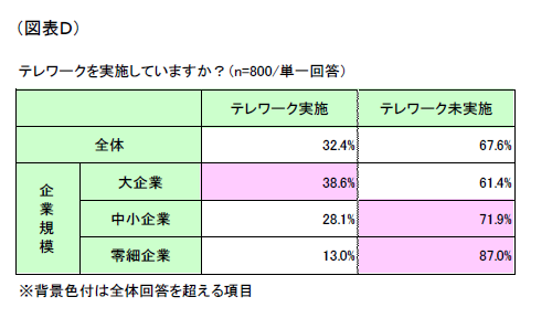 テレワークの実施有無について調査を行ったところ、「テレワーク未実施」(回答率67.6%)が「テレワーク実施」(同32.4%)を大きく上回った。企業別にみると、「テレワーク実施」は、「大企業」(同38.6%)、「中小企業」(同28.1%)、「零細企業」(同13.0%)の順に高い結果となっており、企業規模が大きいほど、テレワークの導入が進んでいる状況となっている。「大企業」よりも「零細企業」の方が、コミュニケーション不足に起因する業務の支障が発生しにくい背景には、少人数によるコミュニケーションの取りやすさに加え、テレワークの普及が進んでいないことがその要因として考えられる。(図表D)
