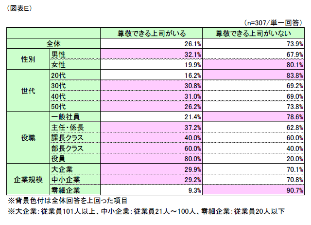 企業別においては、「零細企業」で9割を超える人が「尊敬できる上司がいない」(同 90.7%)と回答しており、少人数の組織における特性が表れているものと考えられる。(図表E)