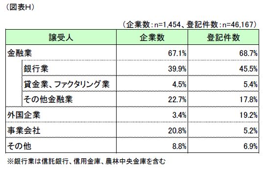 事業会社が譲渡人として設定された46,167件に対し、相手方となる譲受人を集計したところ、企業数としては「銀行業」(企業数割合39.9%)が最も多く、「貸金業、ファクタリング業」(同4.5%)と「その他金融業」(同22.7%)を合わせた金融業全体で67.1%を占めた。登記件数においても、銀行業が45.5%となり、金融業が全体の約7割を占める結果となった。