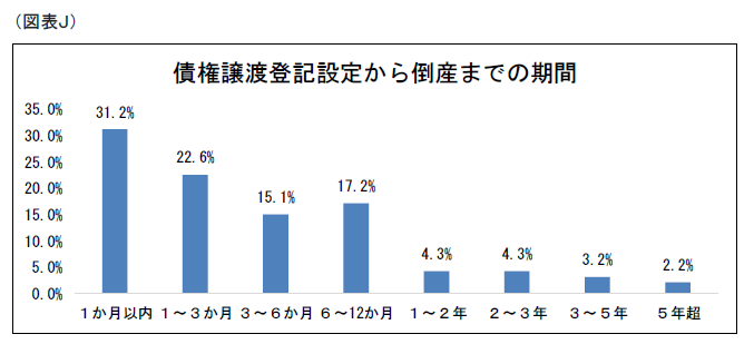 登記設定日および倒産日のデータを有する倒産企業93社に対して、債権譲渡登記設定から倒産に至るまでの期間を分析したところ、「1か月以内」が31.2%と最多となった。3か月以内の倒産が53.8%と半数を超え、86.1%が1年以内に倒産していることから、債権譲渡登記設定直後の倒産リスクが高いことが分かる。