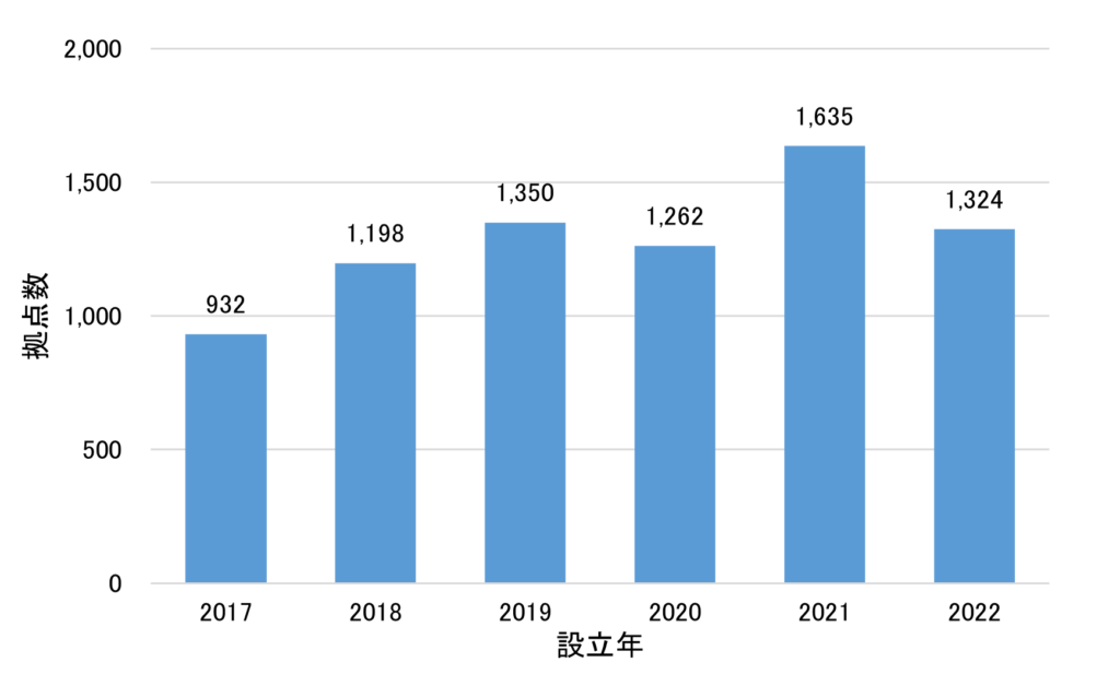 自動車・機械製造業では、「日産自動車」(同99拠点)が6位、空気圧制御機器メーカー「SMC」(同73拠点)が8位となっている。「SMC」は、2021年(同71拠点)に一気に多くの拠点を新設し、2022年は新設していないのに対して、「日産自動車」は、2016年(同34拠点)から2022年(同32拠点)まで、例年安定して20~30拠点前後の出店ペースを維持しており、各社の長期的な生産計画に基づいて拠点を新設している様子が表れている。(図表2)