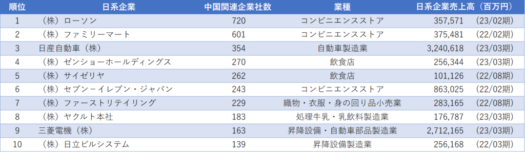 図表2のランキング結果は、リスクモンスターチャイナが調査を行った「中国に進出した日系企業の関連企業数ランキング」(図表3)の結果と一致している企業が多くある。図表3のランキングは、2023年3月時点の中国法人登記情報より確認された日系企業の関連企業数を集計したものであり、ランキングの10位「日立ビルシステム」を除いた9社が、今回のランキング(図表2)に登場している。