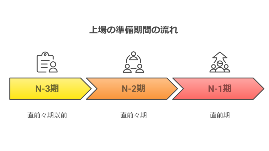上場の準備期間は「直前々期以前(N-3期)/直前々期(N-2期)/直前期(N-1期)」と3段階で区切って捉えるのが一般的です。