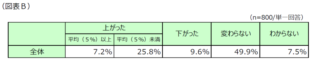 また、給料が「上がった」と回答した人に対して、その賃上げ率を調査したところ、平均賃上げ率(約5%)以上の昇給は、全体の7.2%に留まっていることが明らかとなった。春闘の集計対象が大企業であることを考慮すれば、「全体の昇給状況」と「春闘における平均賃上げ率」に差異が生じることは想定の範囲内といえるが、実態として、約半数において昇給が行われていない状況からは、春闘における平均賃上げ率5.4%には遠く及ばない状態となっていることが読み取れる。(図表B)
