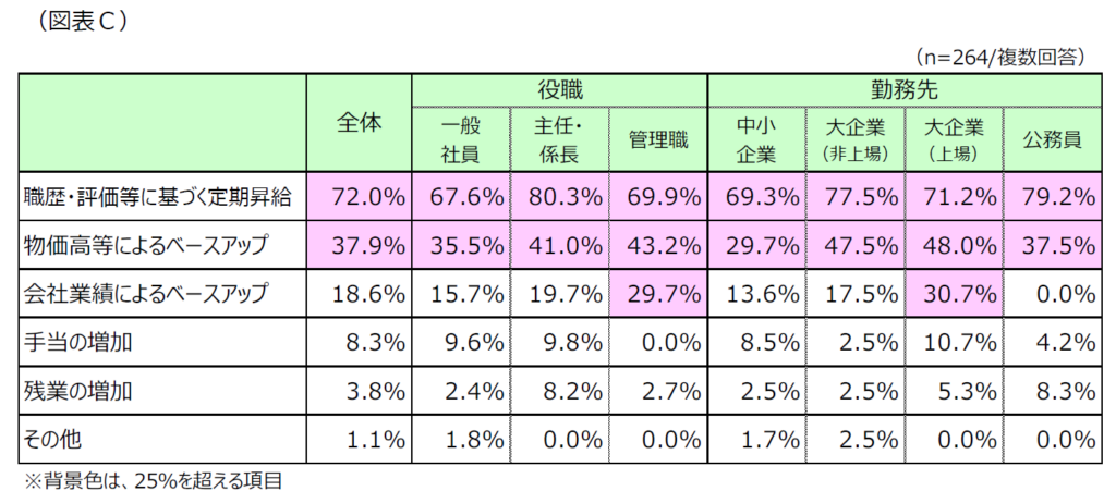 昇給理由を調査したところ、「職歴・評価等に基づく定期昇給」(回答率72.0%)が最も多く、次いで「物価高等によるベースアップ」(同37.9%)と続いた。勤務先の規模を問わず、7~8割の企業において「職歴・評価等に基づく定期昇給」が行われていることが確認できた一方で、「会社業績によるベースアップ」に関しては、報酬が会社業績に連動しやすい役職者や、近年の業績が好調な大企業において実施されやすい傾向にあることが表れている。また、「物価高等によるベースアップ」では、中小企業(同29.7%)と大企業(同47.5%~48.0%)では、約20ポイントの差が生じており、物価上昇に対する賃上げの取り組み状況に大きな差があることが明らかとなった。(図表C)