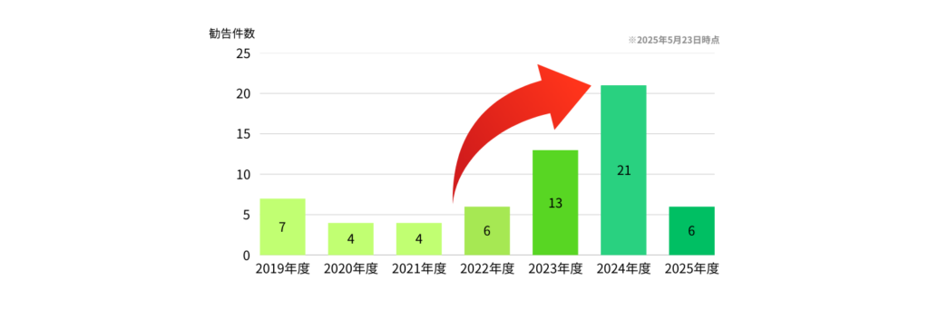 2025年度には5月下旬時点で既に6社の勧告がされており2020年度や2021年度の件数を1ヵ月で上回っています。