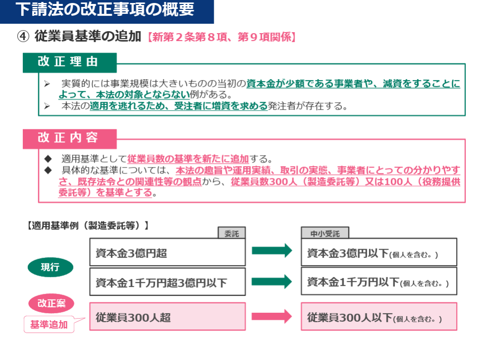 下請法の対象となる取引は、事業者の資本金規模と取引の内容で定義されていましたが、改正法案にて規制及び保護の対象を拡充するために、従業員基準も新たに設けられます。