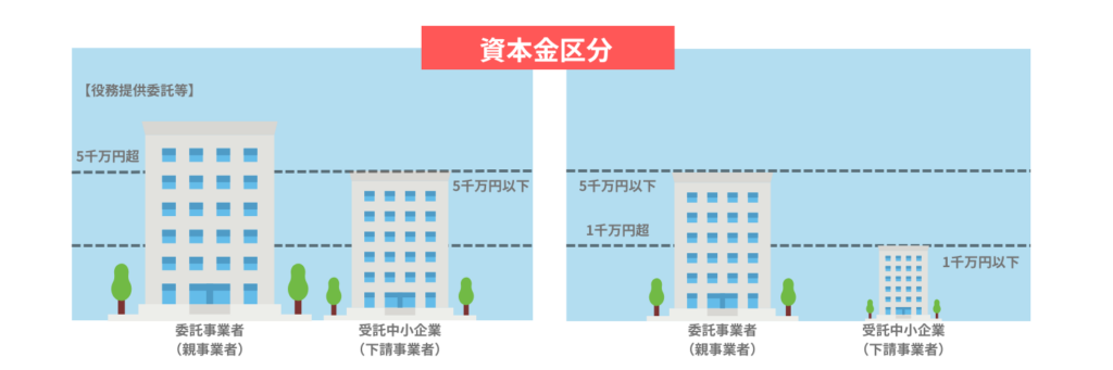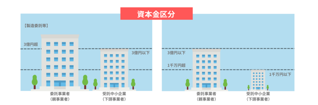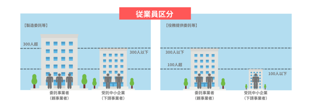 製造委託等の場合は委託側が従業員数300人超の場合、中小受託側が従業員300人以下(個人を含む。)の場合に適用、役務提供委託等の場合は委託側が従業員数100人超の場合、中小受託側が従業員100人以下(個人を含む。)の場合に適用されます。