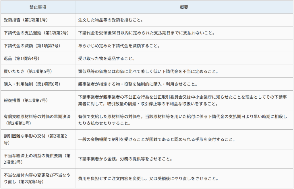 また、下請事業者が親事業者からの不当な取扱いを受けないようにするために、下請法では、親事業者にたいして11の禁止事項を定めています。