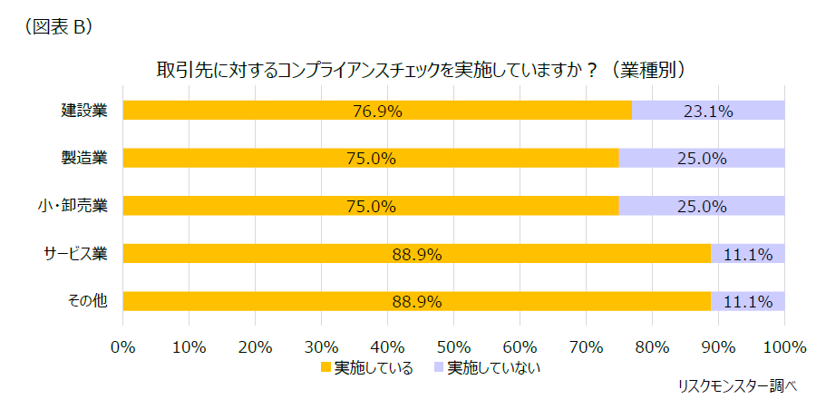 業種別では、「サービス業」において、9割近い企業がコンプライアンスチェックを実施していることが分かった。(図表B)