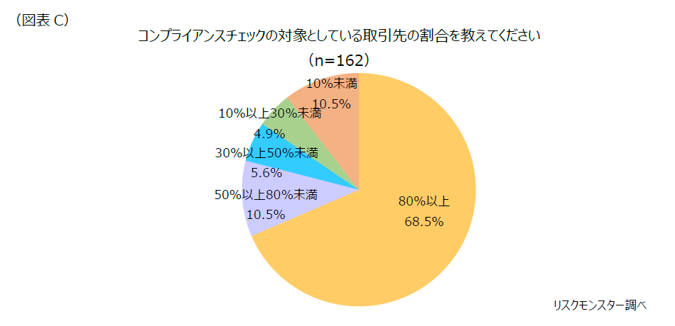 「コンプライアンスチェックを実施している」と回答した企業(164、うち未回答2)に対して、取引先全体のうち、何割の企業をコンプライアンスチェックの対象としているか聞いたところ、「80%以上」(回答率68.5%)が最も多く、次いで「50%以上80%未満」(同10.5%)、「10%未満」(同10.5%)となった。コンプライアンスチェックを実施している企業のうち、約8割は取引先の半数以上をチェック対象としており、3社に2社は取引を行うほとんどの企業をチェック対象としていることが分かった。(図表C)