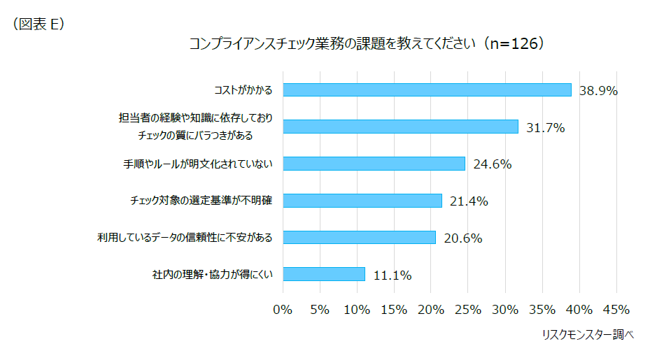 [2] において、取引先に対して網羅的にコンプライアンスチェックの対象としている企業が多いことが表れているが、その反面、多くの企業に対してコンプライアンスチェックを行うためのコストが負担となっているものと考えられる。また、コンプライアンスチェックにおける判定基準やルールが整っていない点について、課題を抱える企業が多い様子も表れた結果となった。(図表E)