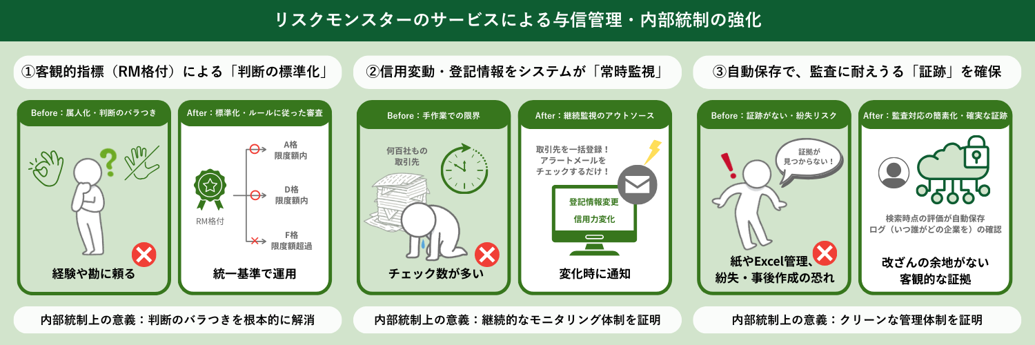 なかでも「リスクモンスターの与信管理クラウドサービス」は、従来の手作業管理で課題となりがちな属人性やモニタリング不足を抑制し、内部統制の実効性を高める仕組みとして活用できます。
