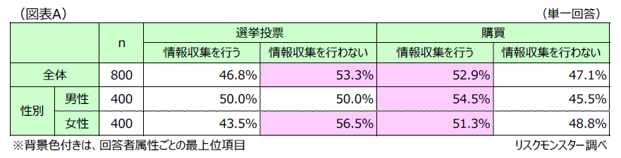 国政選挙における投票時など、政治に関する判断が必要な際(以下、選挙投票時)に、「情報収集を行う」と回答した割合が46.8%であったのに対して、購買行動時の商品選択や可否判断(以下、購買時)に、「情報収集を行う」と回答した割合は52.9%となった。