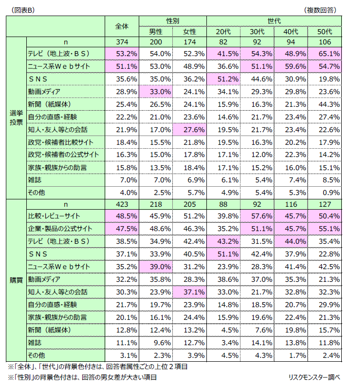 他方、購買時の情報源としては、30代以上において、「比較・レビューサイト」や「企業・製品の公式サイト」を参考にする人が多いのに対して、20代では、「テレビ(地上波・BS)」や「SNS」を参考にする人が多い結果となり、選挙投票時と購買時のいずれにおいても20代における「SNS」の活用度の高さが目立っている。(図表B)