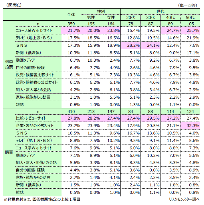 「SNS」については、購買時には、情報源として多用されながらも重要視されていない一面を有する一方で、選挙投票時においては、20代~30代から重要な情報源として活用されている一面も有していることが読み取れる。(図表C)