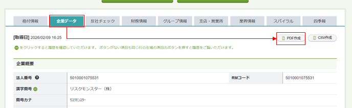 「与信ナビ」>「企業データ」タブを選択し、「PDF作成」ボタンをクリックしてください。