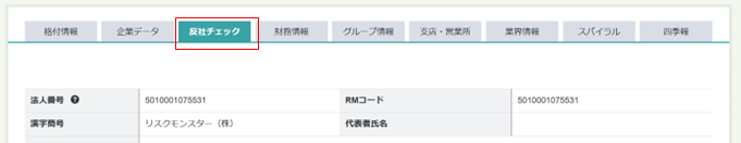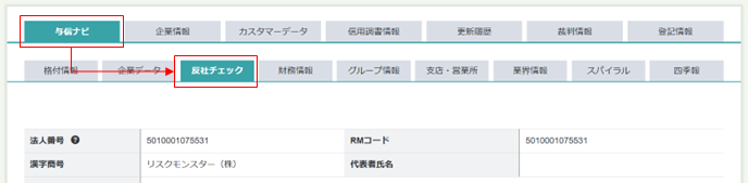 「与信ナビ」>「反社チェック」タブを選択してください。