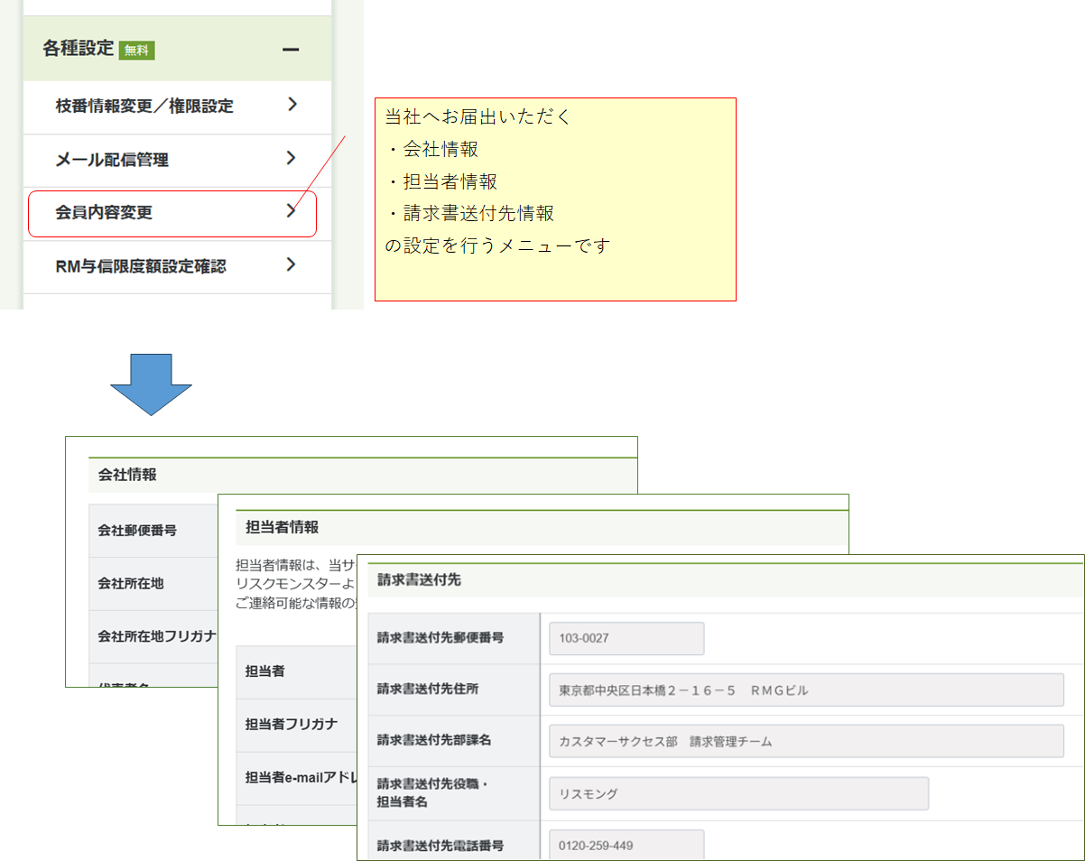 「各種設定」⇒「会員内容変更」メニューより、登録情報の更新をお願いします。