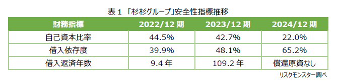 「借入返済年数」とは、企業が仮にすべての税引前純利益を安定的に借入金の返済に充てた場合に、現在の借入額を返済し切るまでに必要となる年数を示す指標である。借入の規模が企業の収益力に見合っているかを計る目安であり、金融機関が追加融資を検討する際の重要な判断材料にもなる。一般的には、「10年を超えると危険水準」とされる。「杉杉グループ」の借入返済年数は、2023/12期に利益の悪化により100年を超える水準まで急激に長期化し、2024/12期には赤字転落したことで、利益による借入返済が事実上不可能な状態に陥っていた。