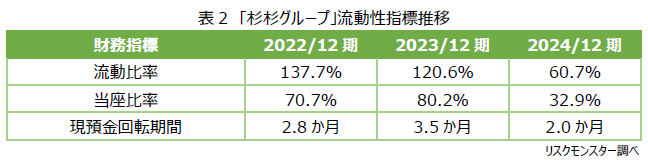 「現預金回転期間」とは、営業上の支払いのための準備資金として何か月分を保有しているかを示す指標である。リスクモンスターの倒産確率分析によれば現預金回転期間が「1か月未満」は高リスクとなるところ、「杉杉グループ」の現預金回転期間は、2024/12期末時点で2.0か月となっており、高リスク水準には至っていないものの、前年度(3.5か月)からは大幅に資金余力が低下していたことが読み取れる。