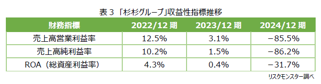 「ROA」は、企業が保有する資産をいかに収益に結びつけているのかを表す指標である。「リスモン業種別審査ノート中国 2024年版」によれば、機械工業における「ROA」の業界平均は3.3%であるのに対して、「杉杉グループ」では、2023年(0.4%)以降、業界平均を下回り、2024年(-31.7%)には大幅なマイナスに転落した。