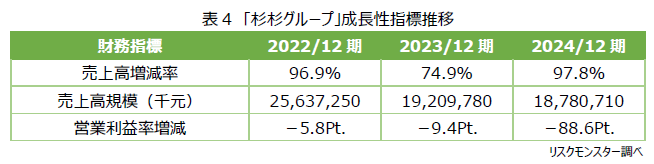 成長性は、売上高や利益の増減率を通じて、企業が将来に向けてどれだけ拡大・発展していけるかを示す。リスクモンスターの倒産確率集計では、減収企業は増収企業に比べて倒産確率が高く、売上高が5%以上減少している場合は、多くの業種で倒産確率が高まる傾向が表れている。また、増減に関わらず、変動幅が大きいほど、倒産確率が高くなる傾向も表れている。「杉杉グループ」の売上高は、3期連続減少となっていた中で、2023/12期には前期比25.1%減となる大幅減収となったことに加えて、営業利益率においても、2022/12期から3期連続悪化となっており、特に2024年(-88.6Pt.)の低下からは深刻な採算悪化がうかがえる。