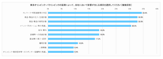 東京オリンピック・パラリンピックの延期によって、どのような企業活動に影響が生じるのか聞いたところ「テレワーク・時差通勤等の対応」(回答率34.4%)が最も多く、次いで「商品・製品の仕入・生産計画」(同32.8%)、「商品・製品の販売計画」(同32.8%)、「イベント・プロモーション等の見直し」(同30.5%)、の順となった。