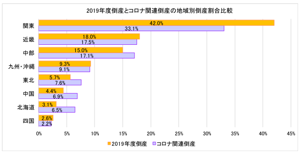 コロナ関連倒産企業について地域別に集計したところ、「関東」(33.1%)が最も多く、「近畿」(17.5%)、「中部」(17.1%)の順となった。2019年度における倒産割合と比較すると、北海道、中国での増加が目立っている。