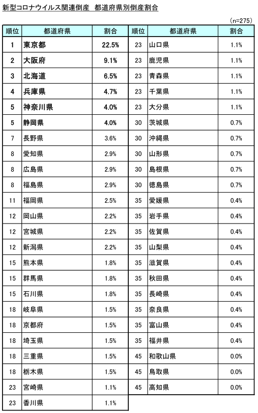 人口の多い大都市では、新型コロナウイルス感染症が拡大しやすいため、外出自粛や営業自粛等による影響が大きく表れているほか、観光地においても本来ゴールデンウィークなどの書き入れ時期に外出自粛となった影響が、倒産の発生として表れているものと考えられる。