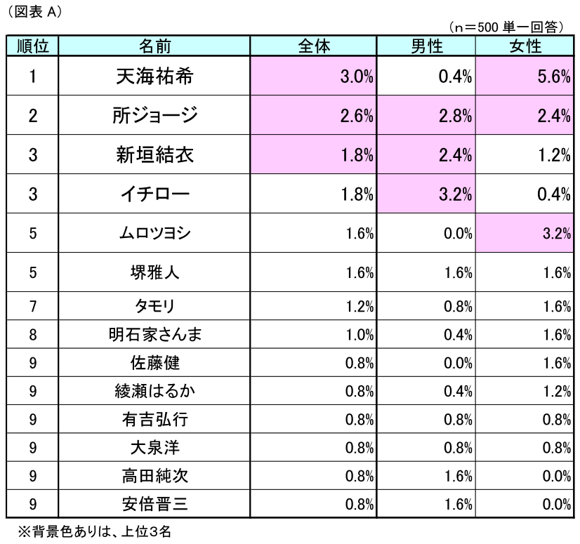 男女別に集計したところ、男性では、1位が「イチロー」(男性回答率3.2%)となり、2位「所ジョージ」(同2.8%)、3位「新垣結衣」(同2.4%)と続いた。一方、女性では、1位が「天海祐希」(女性回答率5.6%)となり、2位「ムロツヨシ」(3.2%)、3位「所ジョージ」(同2.4%)という順位となった。