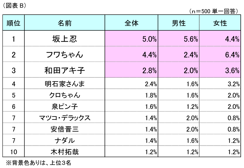 男女別に集計したところ、男性では、1位が「坂上忍」(男性回答率5.6%)となり、2位「フワちゃん」(同2.4%)、3位「和田アキ子」(同2.0%)と続いた。一方、女性では、1位が「フワちゃん」(女性回答率6.4%)となり、2位「坂上忍」(同4.4%)、3位「和田アキ子」(同3.6%)という順位となった。