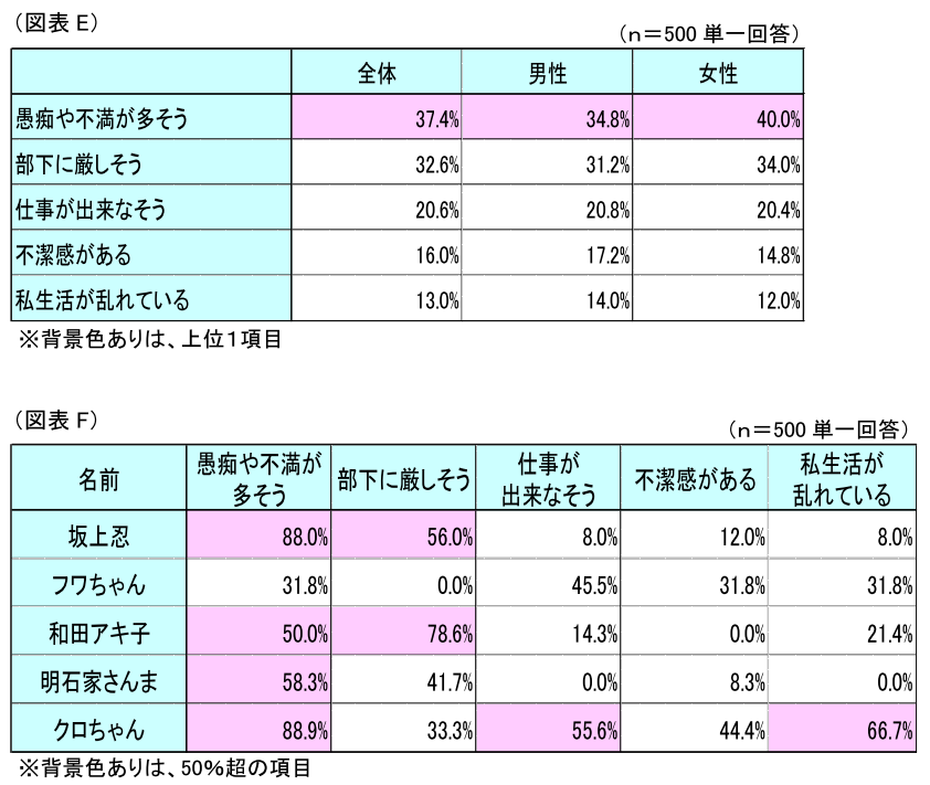 [Q2]のランキング上位者に対して理由を集計したところ、1位の「坂上忍」に対しては、「不満や愚痴が多そう」(同88%)、「部下に厳しそう」(同56%)という意見が多く、2位の「フワちゃん」では、「仕事が出来なそう」(同45.5%)、3位の「和田アキ子」では、「部下に厳しそう」(同78.6%)という意見が最も多い結果となった。ランキング上位者における一緒に働きたくないと思う理由として、多少の相違はあるものの、「愚痴や不満が多そう」という意見が総じて高い傾向にあることから、一緒に働きたくない人のイメージとして重視されていることが表れているといえよう。(図表F)