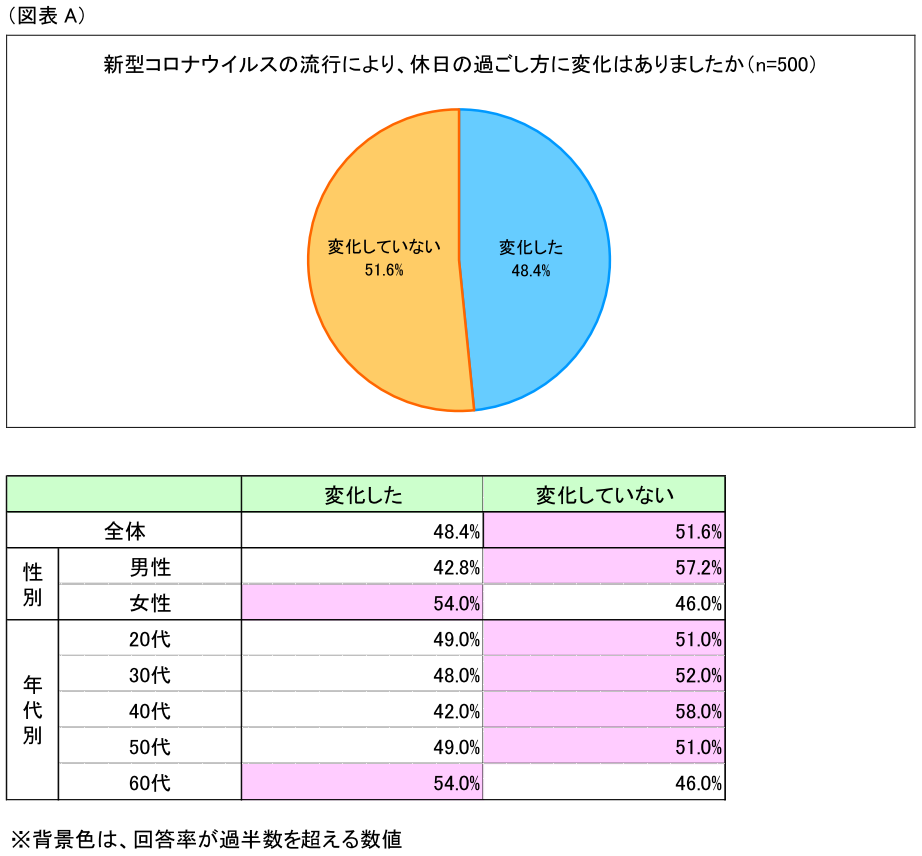 新型コロナウイルスの流行により、休日の過ごし方に変化があったか調査したところ、「変化した」(回答率48.4%)と「変化していない」(同51.6%)が半々となり、拮抗する結果となった。