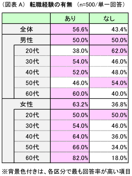 転職経験の有無について、調査したところ、全体では「あり」(回答率56.6%)が、「なし」(同43.4%)を上回る結果となり、半数以上の回答者が1度は転職を経験している結果となった。