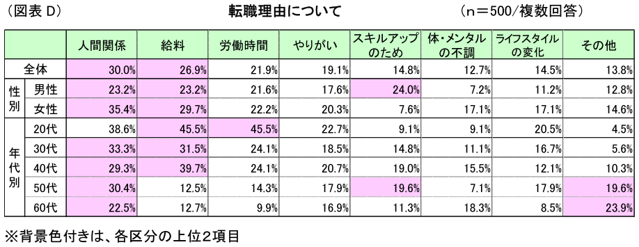 また年代別では、全ての年代において「人間関係」を理由とする転職割合は高く、「やりがい」においても2割前後の水準で存在している。「給与」においては、育児世代の40代以下において高い回答率になっている反面、50代以上では急激に低下している。その他、「労働時間」や「スキルアップのため」においては、年代による増減の傾向がうかがえる。(図表D)