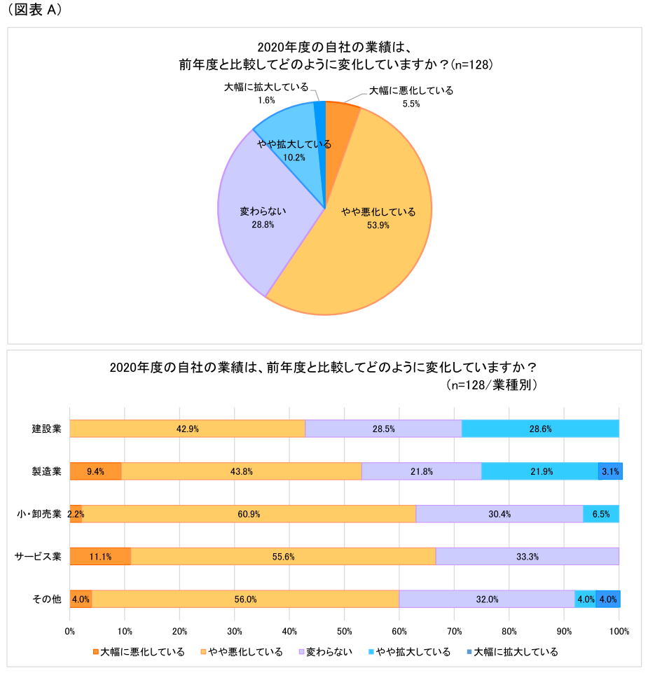 2020年度の業績について、前年度からの変化を聞いたところ、「やや悪化している」(回答率53.9%)が最多となり、「変わらない」(同28.8%)、「やや拡大している」(同10.2%)の順となった。「大幅に悪化している」を含めると、全体の6割の企業において、前年度と比べて業績が悪化していることが明らかとなった。