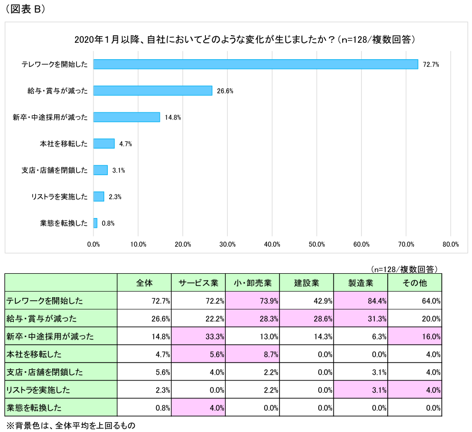 「サービス業」においては、「新卒・中途採用の減少」(同33.3%)や「支店・店舗を閉鎖した」(同4.0%)が多く、来期以降の業績悪化懸念に対する固定費削減の動きがうかがえる。(図表B)