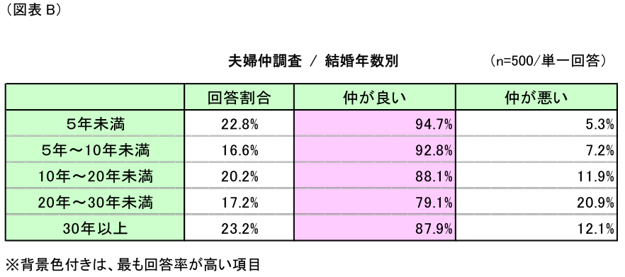 今回、ほとんどの夫婦は仲が良いとの結果となったが、結婚年数を重ねると徐々に仲の良さが薄れる傾向もみられていることから、これからも互いを気遣って良いコミュニケーションを取り、長く夫婦仲の良さを維持してもらいたい。