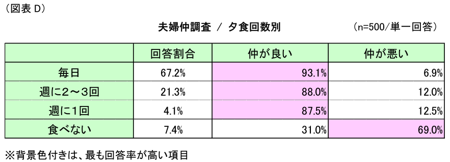 1週間のうち、夫婦が一緒に夕食を食べる回数別の調査では、週1回以上一緒に夕食を取る夫婦(回答率87.5%)と、全く一緒に夕食を取らない夫婦(同31.0%)で夫婦仲に大きな差がみられた。