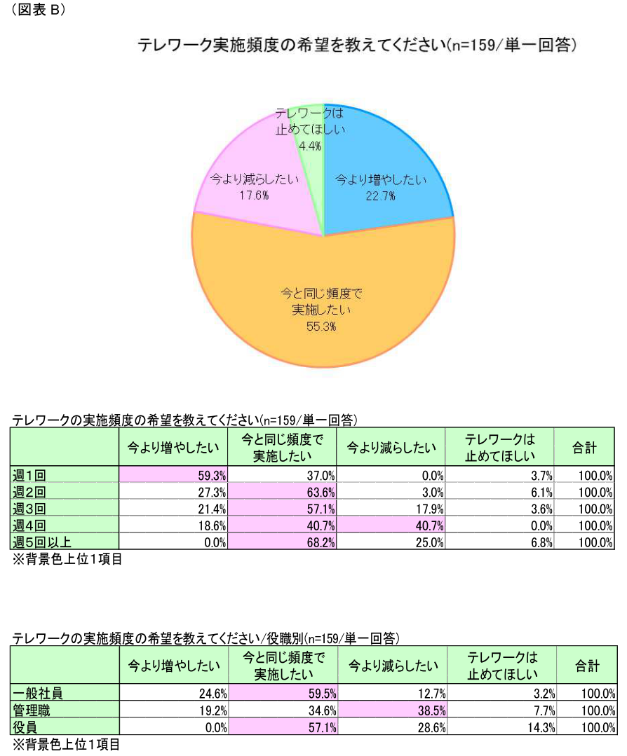 役職別にみると、「一般社員」と「役員」においては、「今と同じ頻度で実施したい」(同各59.5%、57.1%)が最も多く、「管理職」においては「今より減らしたい」(同38.5%)が最も多い結果となり、管理職層においては、テレワークに消極的な様子が表れている。(図表B)