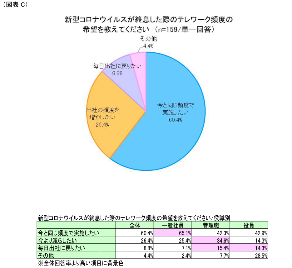役職別では、「今と同じ頻度で実施したい」において、一般社員(同65.1%)のみが全体(同60.4%)を上回っており、「毎日出社に戻りたい」においては、管理職(同15.4%)、役員(同14.3%)が一般社員(同7.1%)の倍となっているなど、一般社員と管理職以上とで、テレワークに対する積極性に差が見られる結果となった。(図表C)
